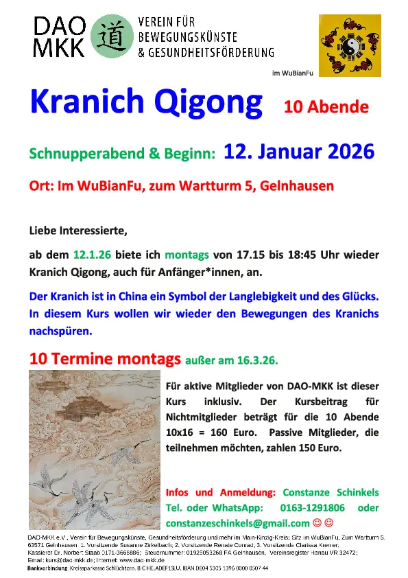 Hier finden Sie unser komplettes Kursangebot im Bereich der Bewegungskünste an den Veranstaltungsorten Gelnhausen / Wächtersbach. Das Angebot ist in die Rubriken Qigong Kurse und Taiji Kurse aufgeteilt.